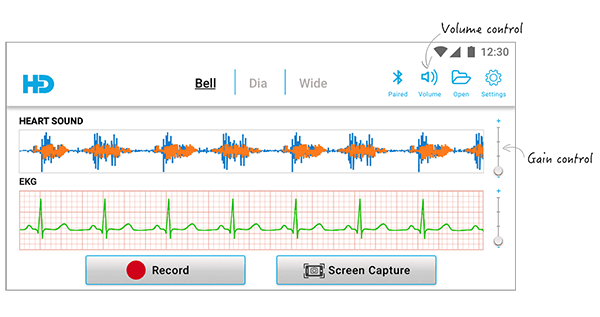 • Visualize heart sounds and ECG waveforms on a native app smart device